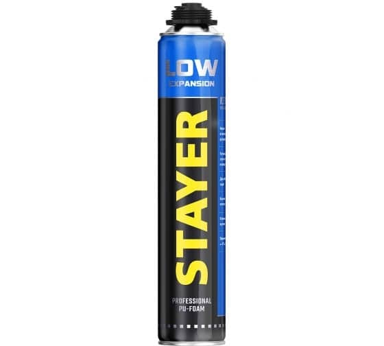 Монтажная пена STAYER LOW EXPANSION 750 мл с низким вторичным расширением, пистолетная, всесезонная применяется для монтажа и герметизации оконных и дверных блоков, подоконников, а также для изоляции проводки и технических коммуникаций, тепло- и звукоизоляции, заполнения швов, щелей, пустот. Можно использовать в широком температурном диапазоне: от -10 до +35°С.
