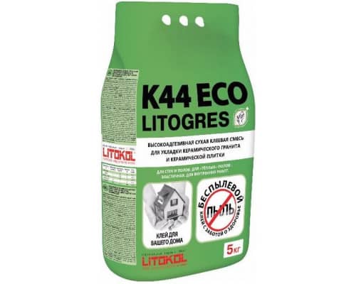 LITOGRES K44 ECO предназначен для укладки керамогранита, керамической плитки, клинкера, натурального камня с устойчивой структурой размером до 90х60 см на стабильные основания. Для внутренних и наружных работ.