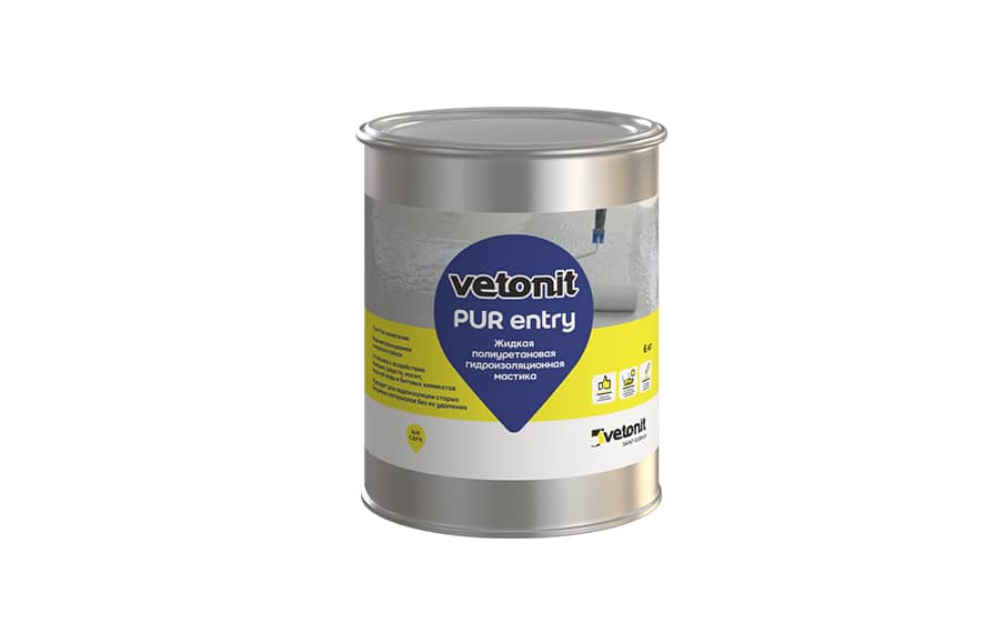Vetonit PUR entry — жидкая однокомпонентная поли уретановая мастика, образующая после застывания бесшовную гидроизоляционную высокоэластичную мембрану, рассчитанную на весь срок служ бы здания.
