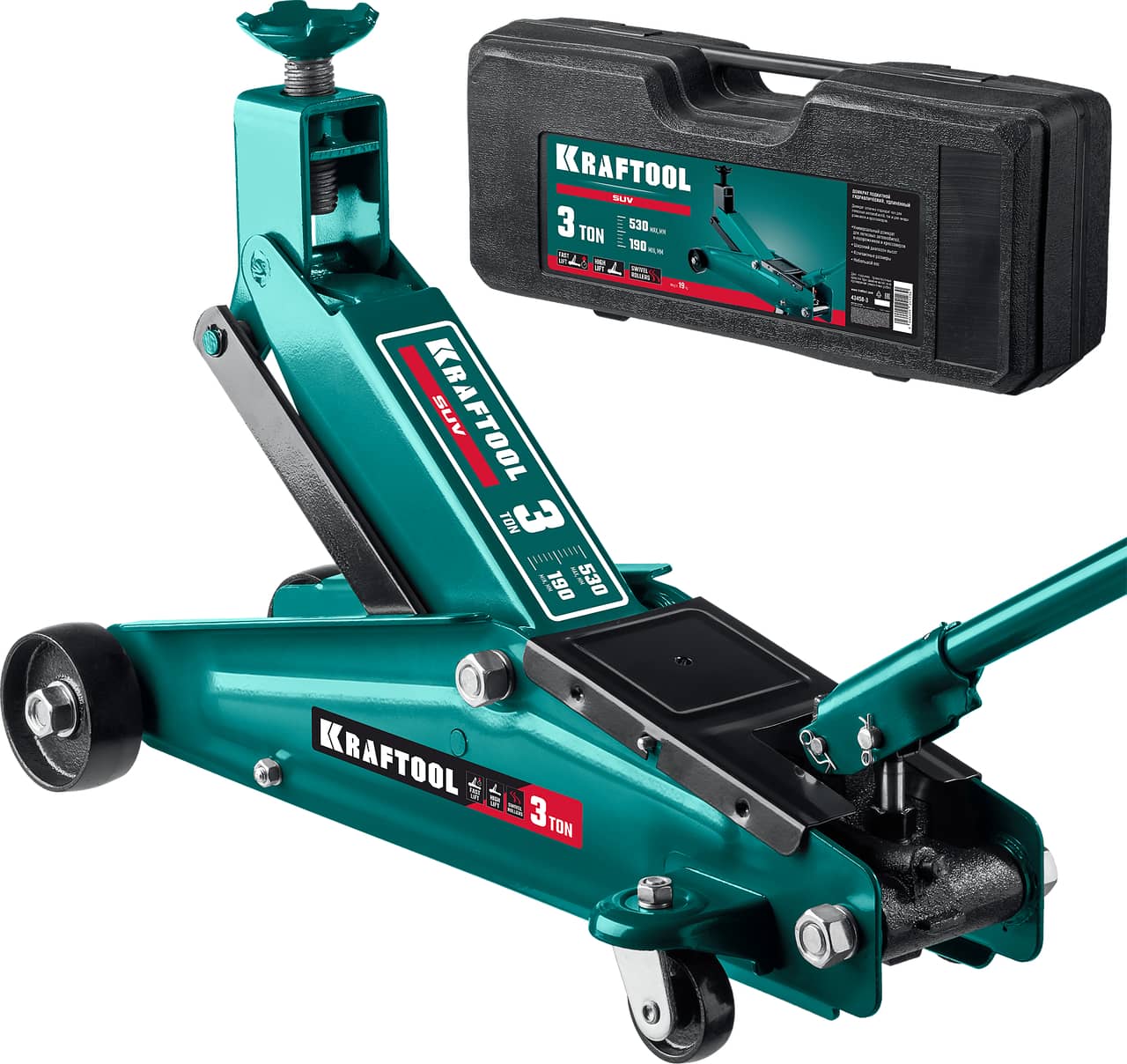 KRAFTOOL SUV, в кейсе 3 т, 190 - 530 мм, подкатной домкрат с высоким подъемом (43458-3-K)