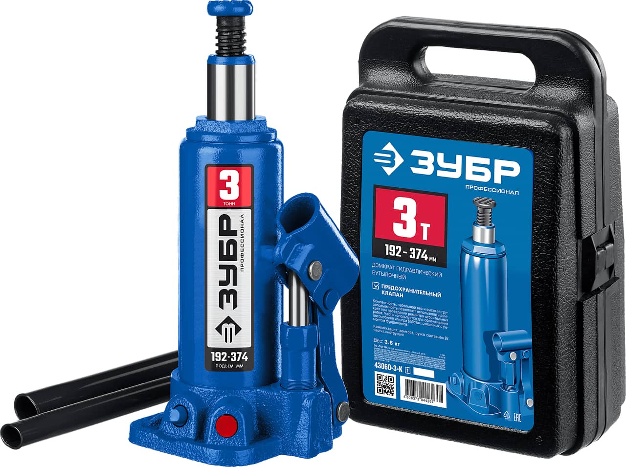 ЗУБР 3 т, 194 - 372 мм, бутылочный гидравлический домкрат в кейсе, Профессионал (43060-3-K)