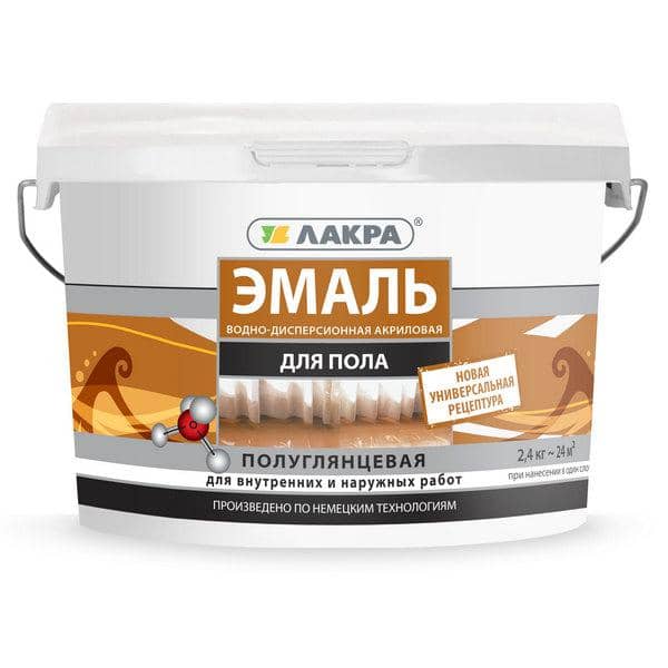 Область применения Эмаль акриловая для пола Лакра: Применяется для окраски деревянных полов внутри и снаружи помещений, бетонных полов внутри бытовых помещений. Может применяться для окраски дверей, мебели и др. поверхностей внутри помещений.