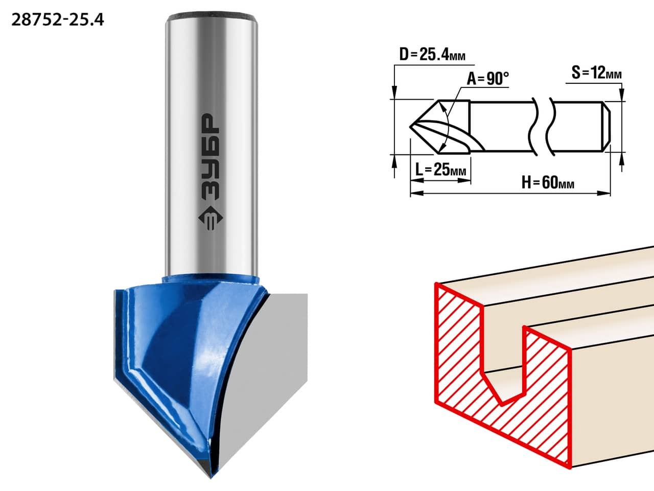 ЗУБР 25.4 x 25 мм, угол 90° мм, фреза пазовая галтельная V-образная, Профессионал (28752-25.4)