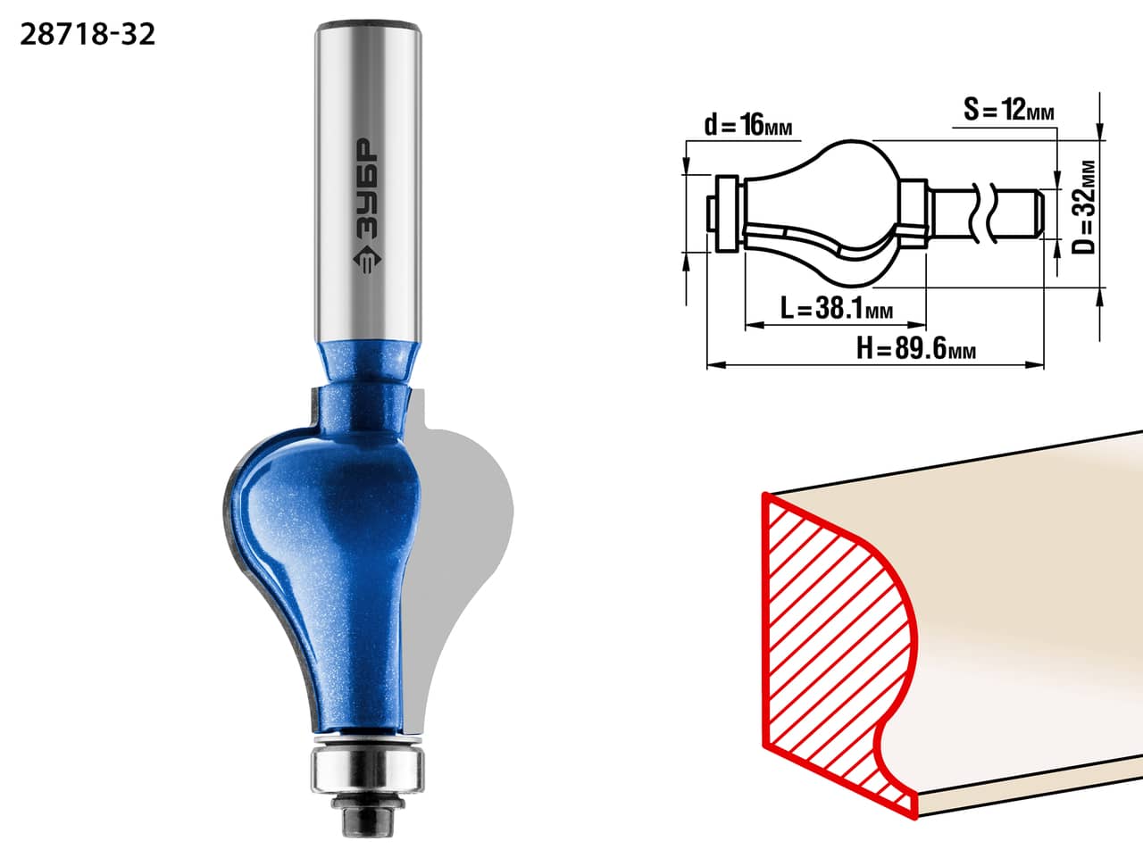 ЗУБР 32 x 38 мм, хвостовик 12 мм, фреза кромочная фигурная №7, Профессионал (28718-32)