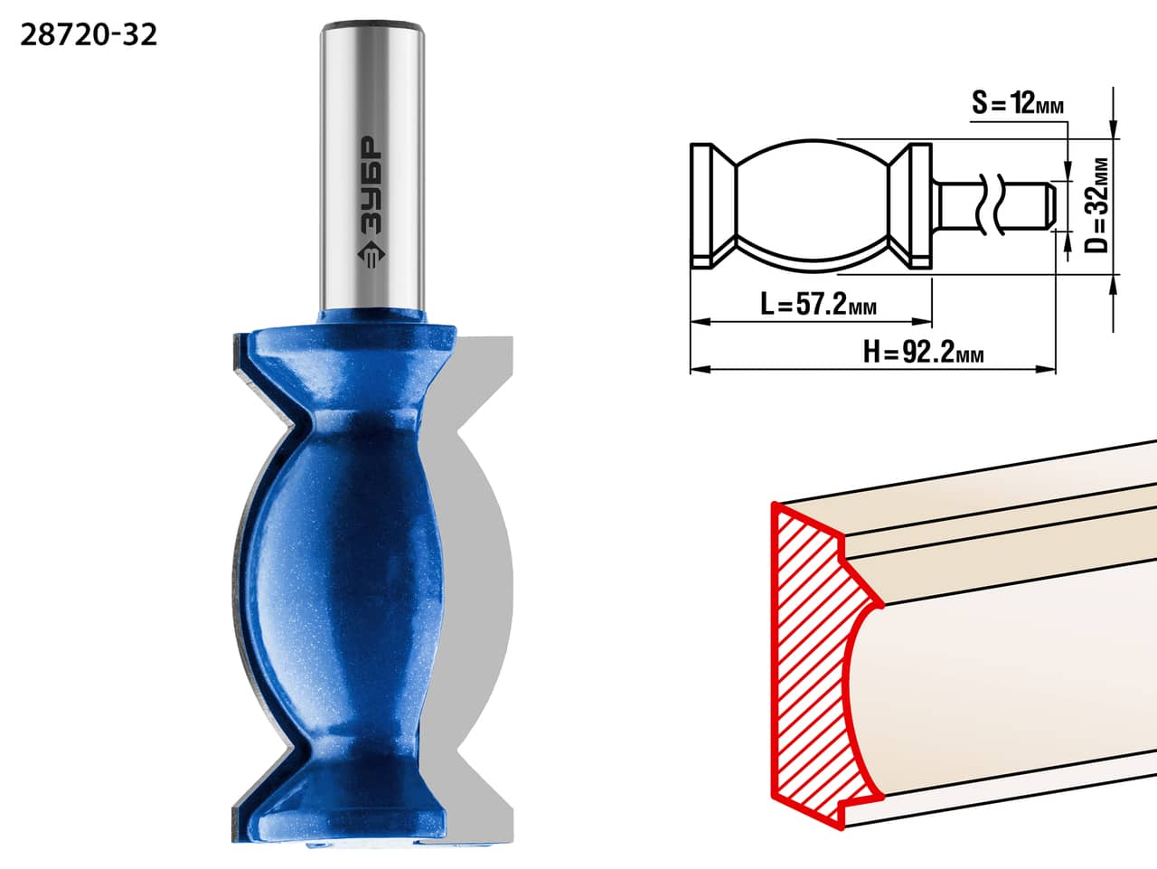 ЗУБР 32 x 57 мм, хвостовик 12 мм, фреза кромочная фигурная №9, Профессионал (28720-32)