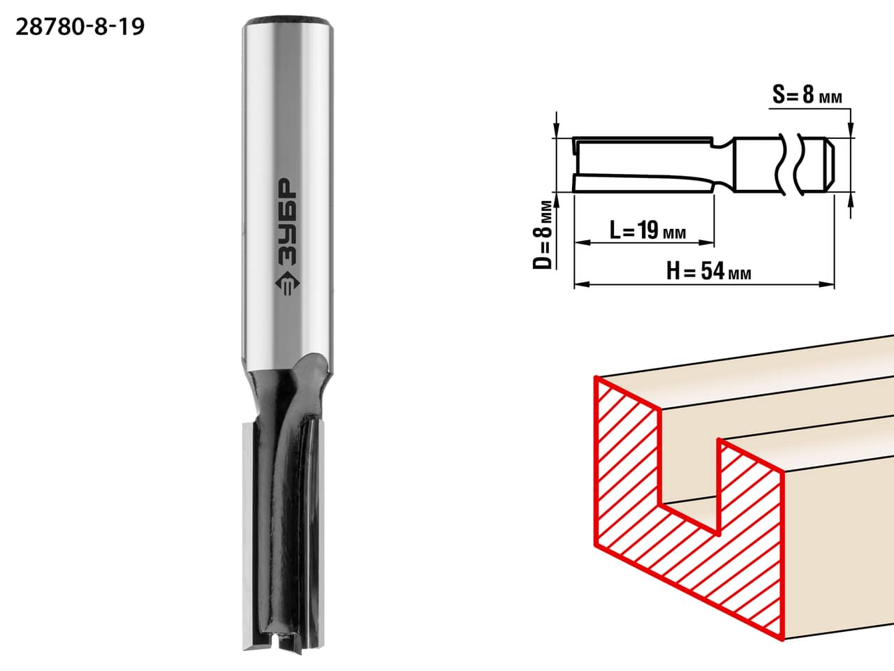 ЗУБР 8 x 19 мм, хвостовик 8 мм, фреза пазовая прямая, Профессионал (28780-8-19)