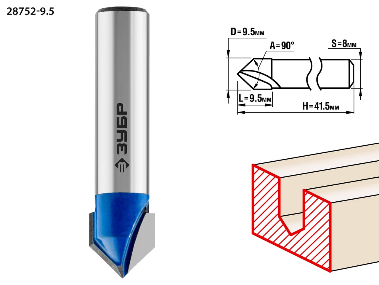 ЗУБР 9.5 x 9.5 мм, угол 90° мм, фреза пазовая галтельная V-образная, Профессионал (28752-9.5)