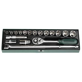Комплект поставки (комплектация): Головки торцовые: 12, 13, 14, 15, 17, 19, 21, 22, 23, 24, 27, 30, 32 мм - 13 шт. Головки торцовые свечные: 16, 21 мм - 2 шт. Удлинитель : 125 мм - 1 шт. Трещотка: 36 зубьев, быстрый сброс, 275 мм - 1 шт. Вороток перекидной: 457 мм - 1 шт.