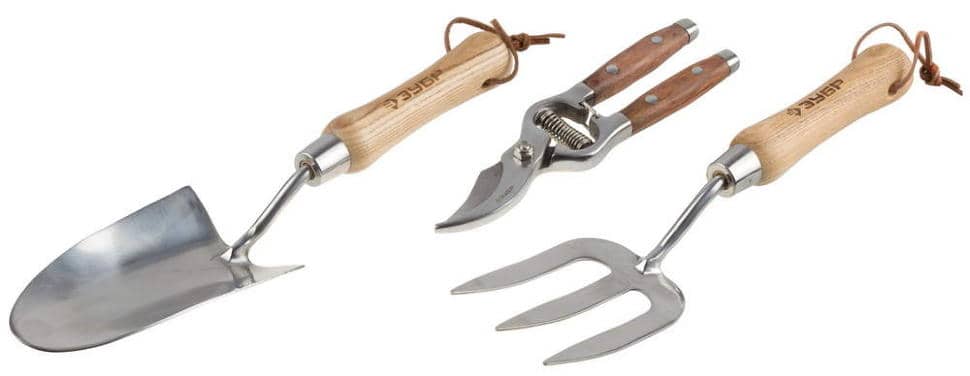 Набор ЗУБР "ЭКСПЕРТ" садовый: совок посадочный широкий, вилка посадочная, секатор