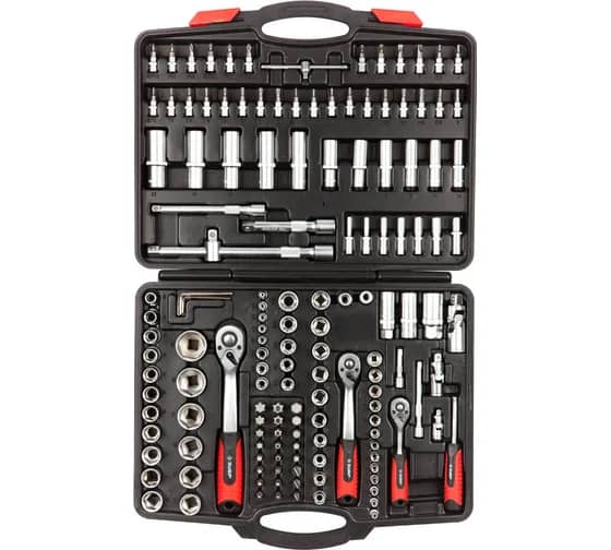 Набор торцевых головок Зубр МАСТЕР FLANK 1/2", 3/8", 1/4" , биты, доп.принадлежности, Cr-V, 4-32мм, 150 предметов подходит для эксплуатации в автосервисах, мастерских, на станциях технического обслуживания. Относится к профессиональному классу.
