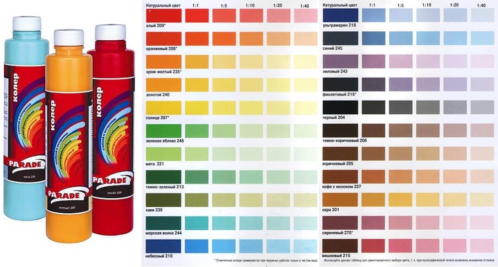 Для внутренних и наружных работ. Предназначен для тонирования всех видов красок, шпатлевок и декоративных штукатурок на водной основе. Допускает использование в концентрированном виде для специальных случаев оформления интерьеров и фасадов зданий. Тона, обозначенные звездочкой на цветовой маркировке, не рекомендуется применять для колеровки красок, которые используются для наружных работ.