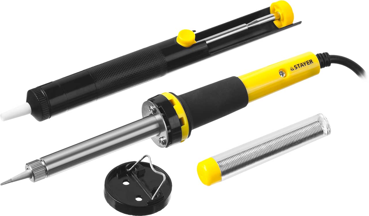 STAYER PROTerm, 30 Вт, с 2к рукояткой, конус, оловоотсос + подставка + припой, набор для паяльных работ, Professional (55316-30-H4)