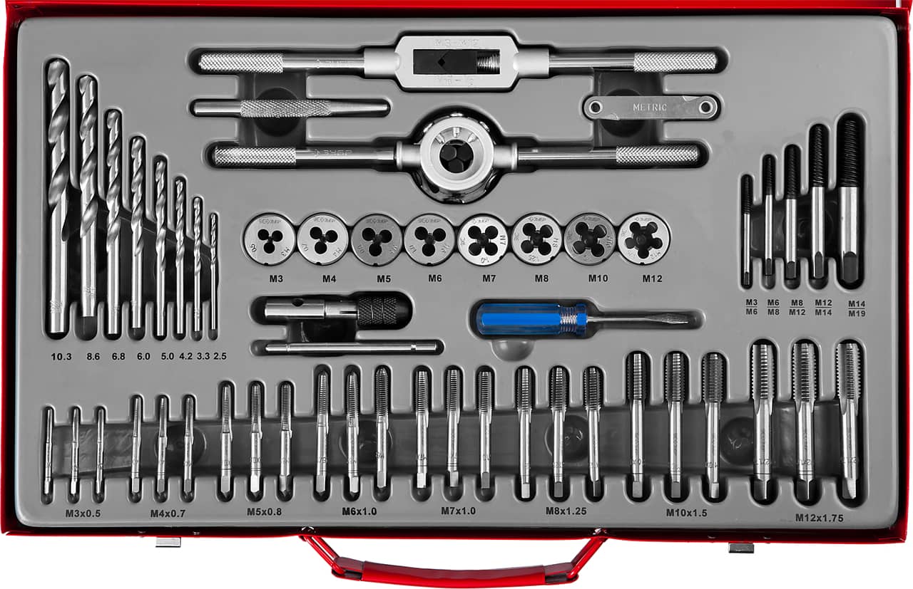 - Наборы с металорежущим инструментом оптимально скомпонованы для решения большинства задач по нарезанию резьбы. Высокое качество инструментов, входящих в набор, позволяет получить максимально качественный результат даже в самых трудных условиях