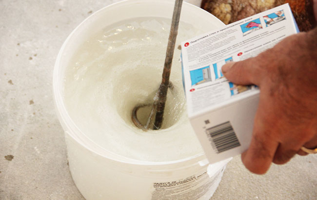 Для приготовления клея потребуется эмалированное ведро. В него нужно поместить порошок клея. Воду возьмите комнатной температуры в количестве, указанном на упаковке. Если собираетесь предварительно грунтовать стену при помощи клея, то разведите до более жидкой консистенции. Далее тщательно размешайте смесь до однородности с помощью подручных инструментов или строительного миксера. Через указанное в рекомендациях к клеевому составу время снова перемешайте содержимое ведра и приступайте к отделке.