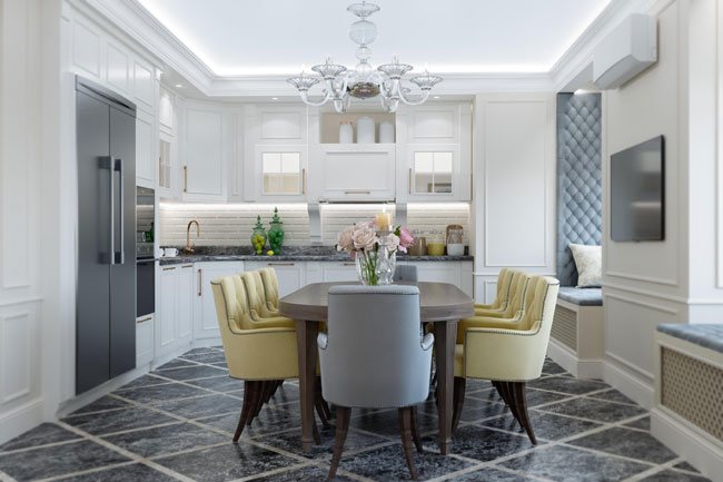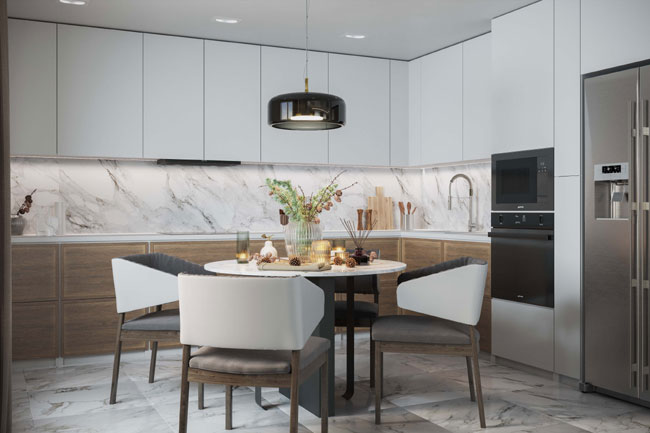 При желании сделать интерьер визуально дороже и элегантнее, используйте керамогранит, кварцвинил или кафель с имитацией натуральных материалов: дерева, мрамора, камня. Такой дизайн универсален: подойдет и для современных, и для классических кухонь.