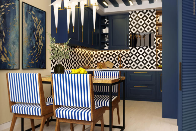Яркие орнаменты привлекают внимание. Этим можно воспользоваться, если у вас маленькая кухня или не идеально ровные стены. Акцентная плитка с активным узором будет притягивать взгляд и отвлекать от тех или иных особенностей комнаты, в том числе — от реальных пропорций. Но в этом случае лучше использовать светлые мебель и отделку.