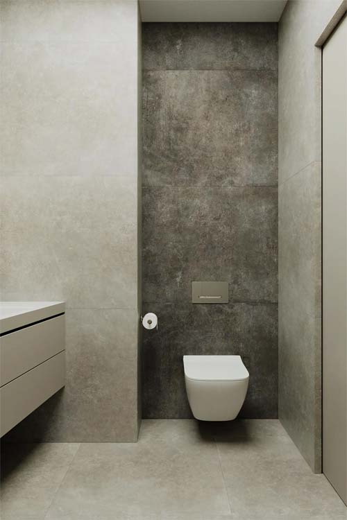 В индустриальном стиле можно смело выбирать плитку под бетон в ванную, кухню, гостиную и даже спальню. Настенные и напольные бетонные панели создадут фон для белоснежной сантехники. Цвет и фактура бетона – прекрасный фон для сияющих металлов. В моду входят санузлы в индустриальной стилистике: