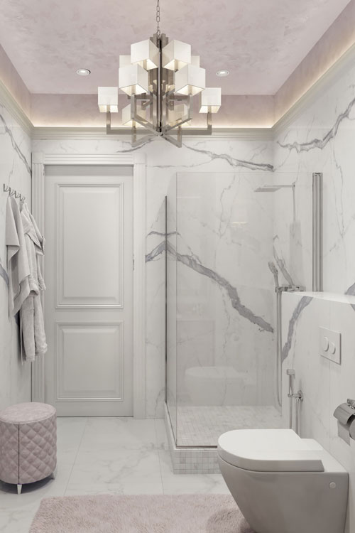 Классический вариант отделки стен санузла. Элементы, покрытые глазурью, применяются в стильных, дорогих интерьерах в стиле модерн, арт-деко, а также в большинстве типовых решений ремонта.