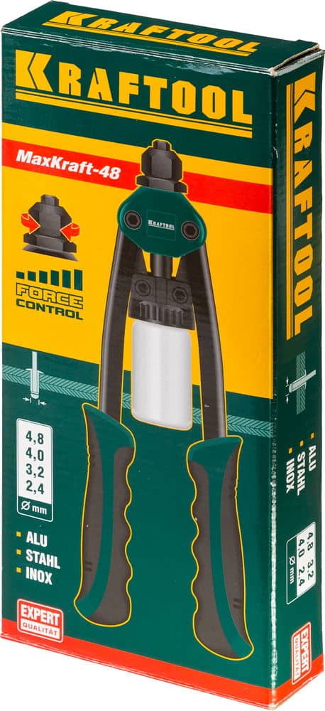 Заклепочник двуручный силовой компактный, KRAFTOOL "MaxKraft-48" 31161, для заклёпок d=2,4-4,8 мм из Al, стали, нерж стали, усил литой корпус