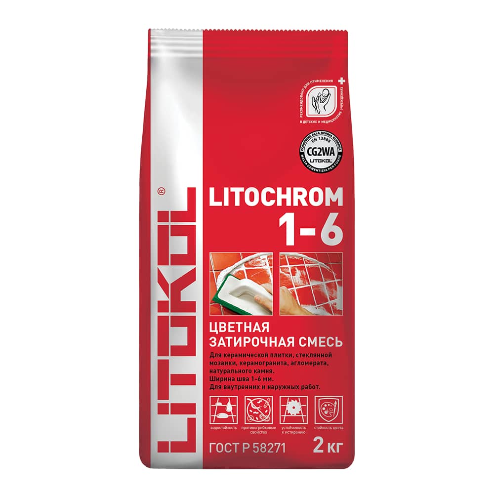 LITOCHROM 1-6 — затирочная смесь на основе цемента, минеральных наполнителей, высококачественных полимерных и органических добавок и цветных пигментов. Предназначена для затирки межплиточных швов, шириной от 1 до 6 мм включительно, при облицовке стен и полов керамической плиткой, стеклянной мозаикой, керамогранитом, натуральным камнем, агломератом.