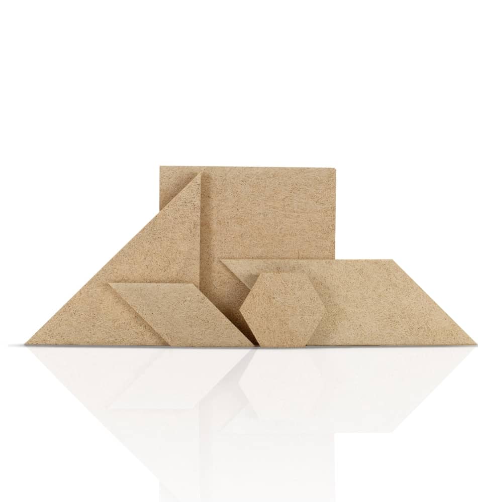 Саундек Панно представлен в виде 4 основных форм: прямоугольник, квадрат, треугольник и гексагон. Возможно изготовление нестандартных форм по индивидуальному чертежу (размер сырья 2,4х0,6 м).